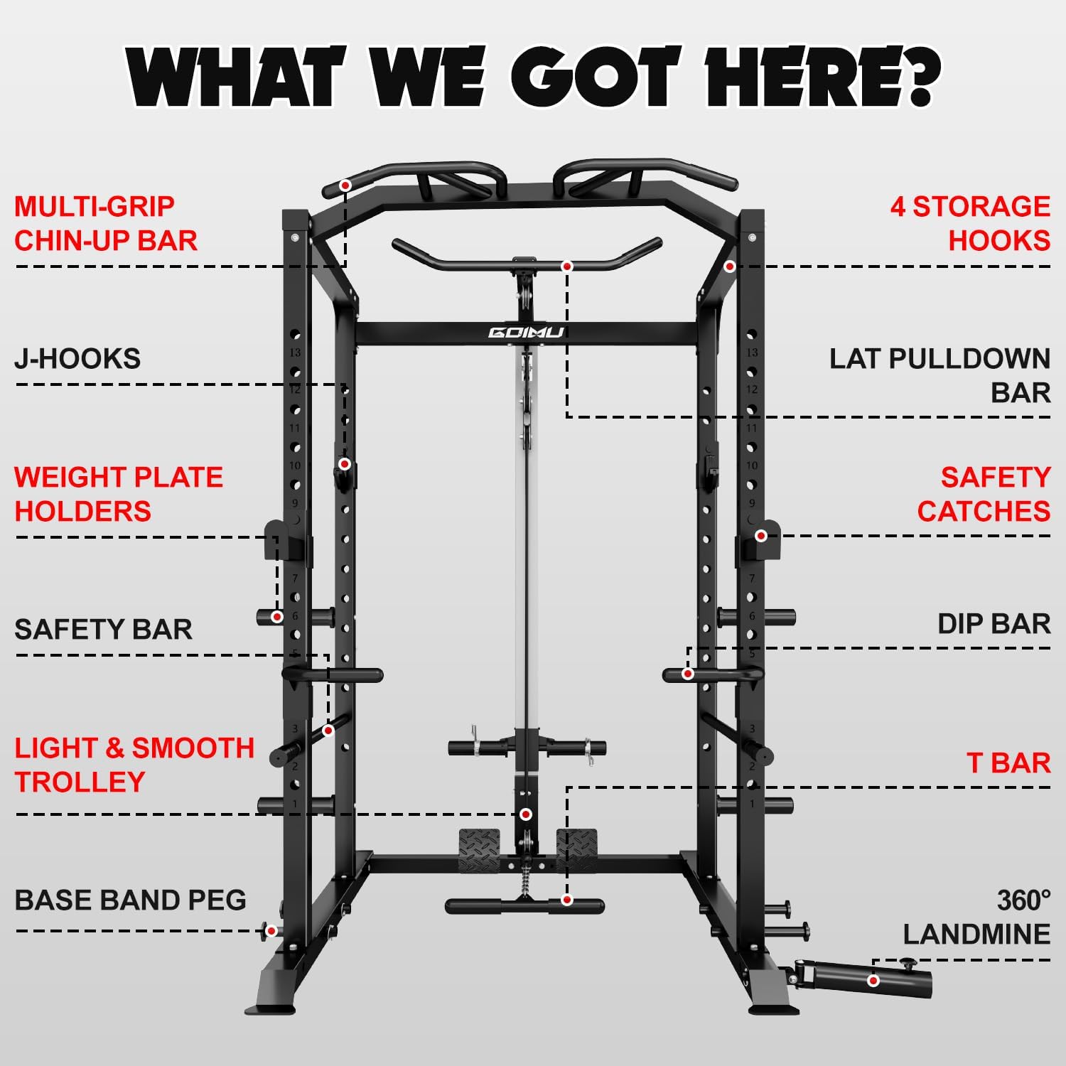The Goimu C1 Power Cage comes with a variety of accessories to enhance your training: