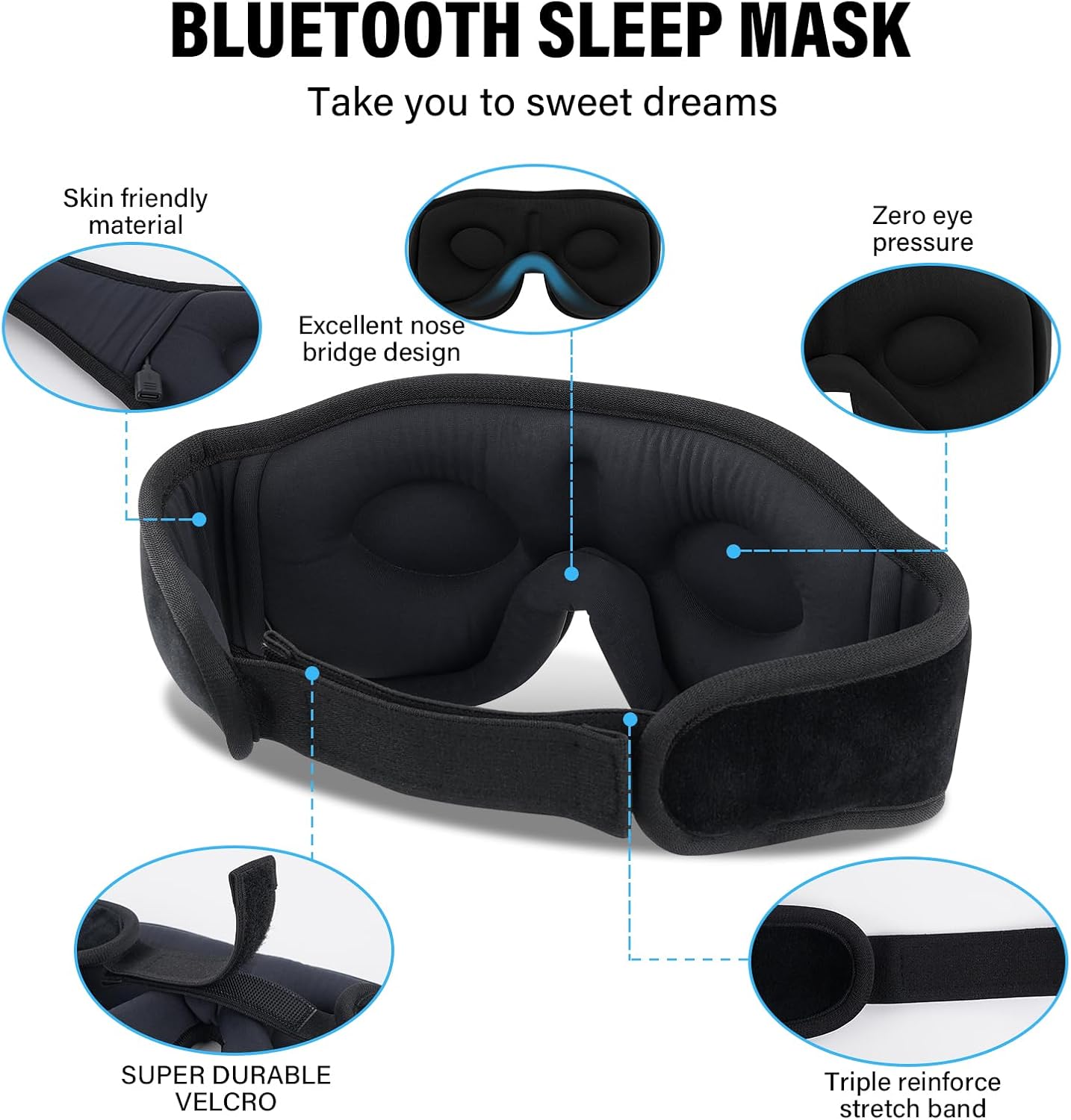 Figure 1: Morelax Bluetooth Sleep Mask MA303-1, highlighting skin-friendly material, excellent nose bridge design, zero eye pressure, super durable Velcro, and a triple reinforced stretch band.