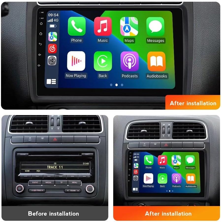 This image illustrates the appearance of the car's dashboard before and after the installation of the MekedeTech Android Head Unit, showcasing the integrated 9-inch display.